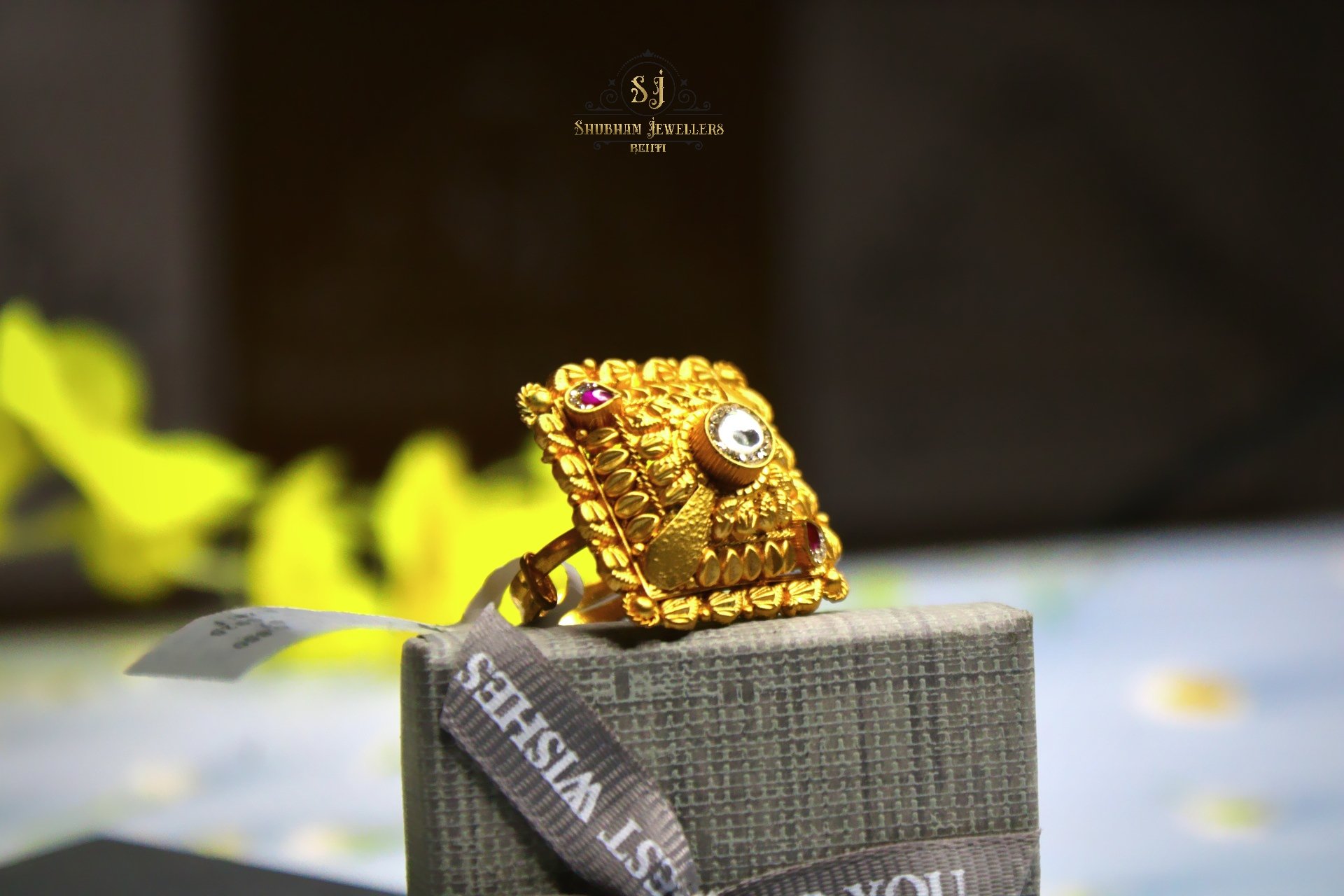 Crafted with precision, this ring showcases a bold square design with intricate carvings and embedded decorative stones, giving it a rich and royal appearance.