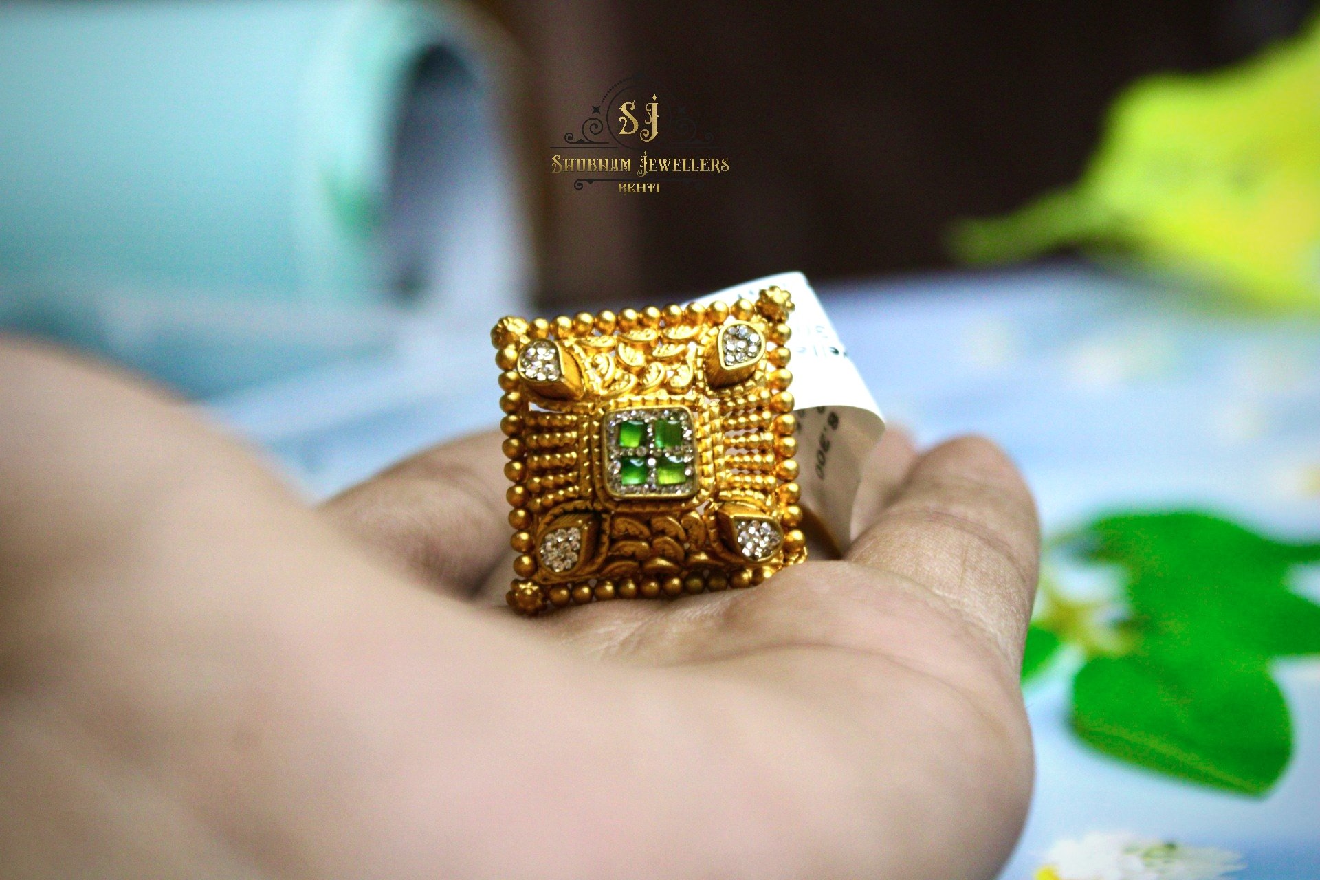 This ring features a striking square design with intricate temple-inspired detailing, highlighted by vibrant green center stones and surrounding sparkling accents.