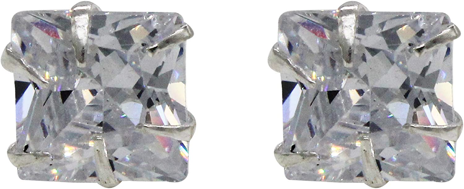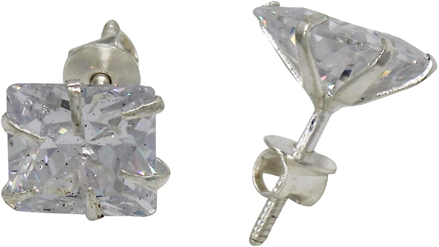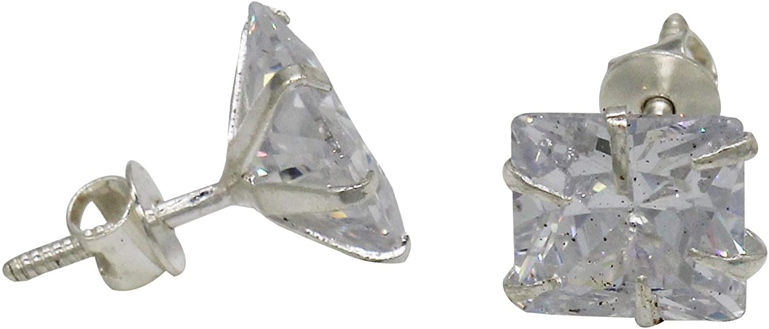 925-92.5 Sterling Silver Princess Cut Real Cubic Zirconia Fashion Stud Earrings For Men,Women,Children,Boys and Girls 9MM