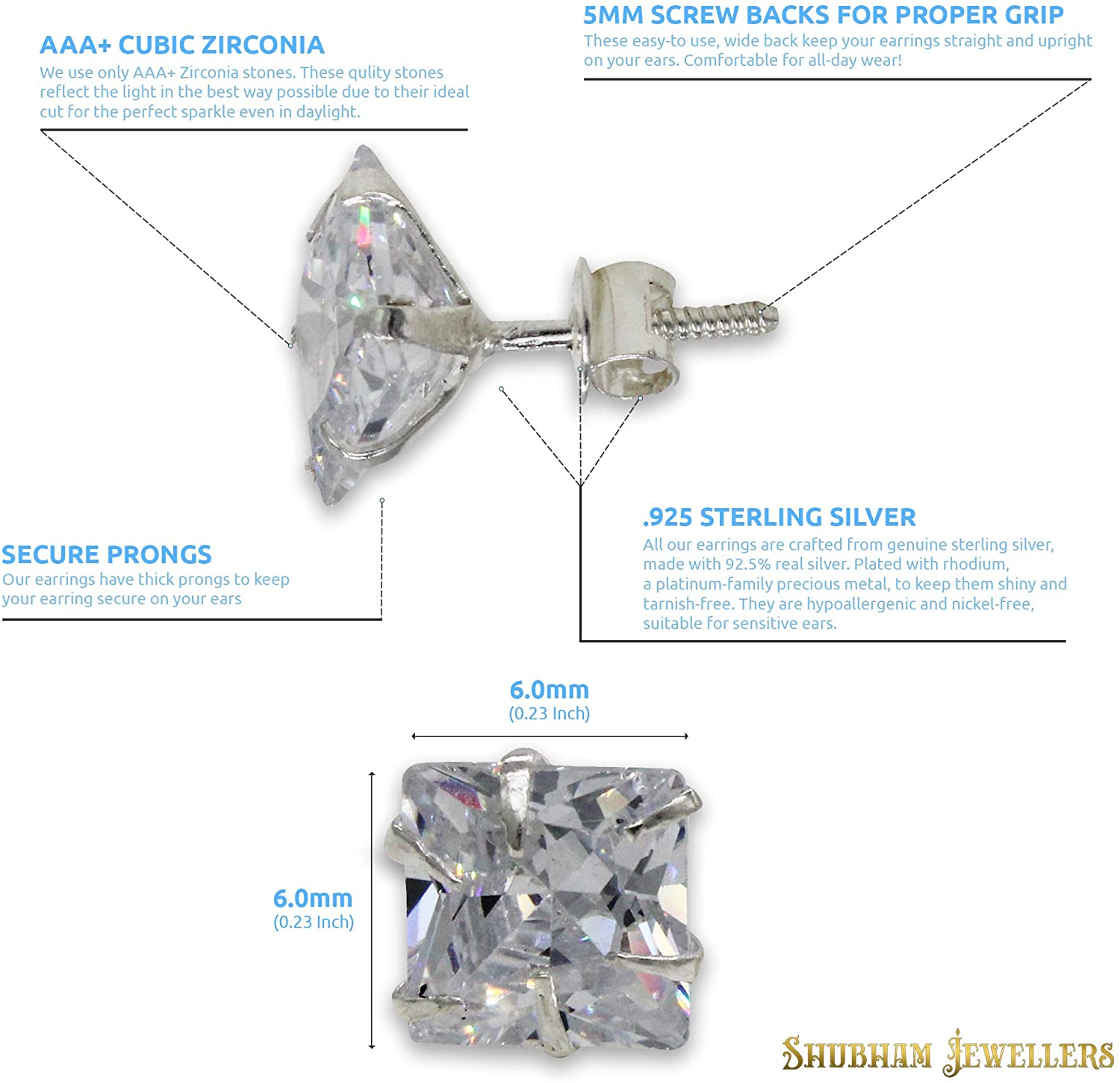 925-92.5 Sterling Silver Princess Cut Real Cubic Zirconia Fashion Stud Earrings For Men,Women,Children,Boys and Girls 5 MM